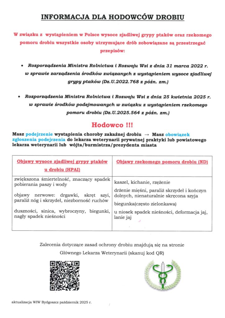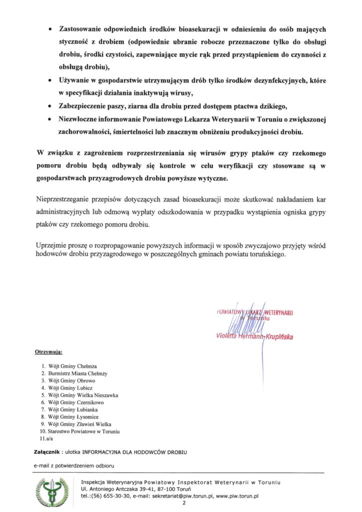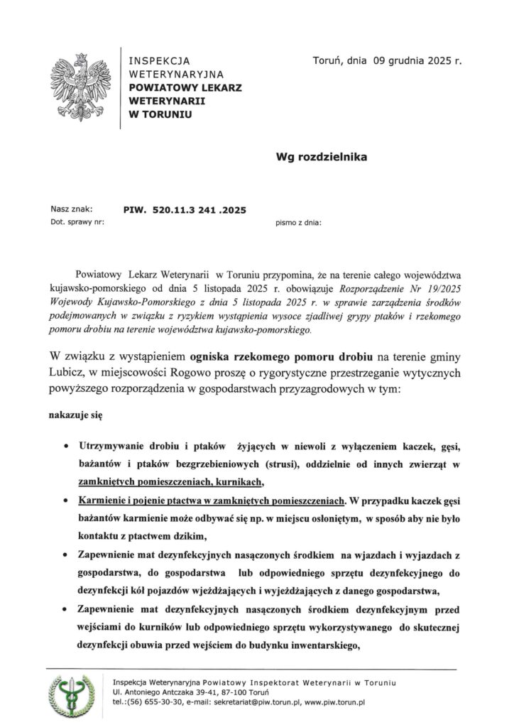 Pismo Powiatowego Lekarza Weterynarii w Toruniu dot. ogniska rzekomego pomoru drobiu na terenie gminy Lubicz w miejscowości Rogowo z prośbą o rygorystyczne przestrzeganie wytycznych rozporządzenia zacytowanego w piśmie w gospodarstwach przyzagrodowych wraz z załącznikiem: ulotka „INFORMACYJNA DLA HODOWCÓW DROBIU”.