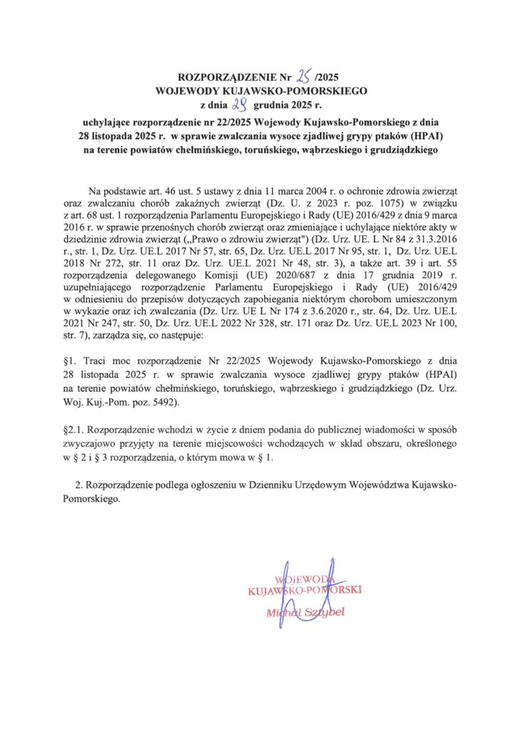 Wojewoda Kujawsko-Pomorskiego uchylił rozporządzenie dotyczące zwalczania wysoce zjadliwej grypy ptaków (HPAI) na terenie powiatów: chełmińskiego, toruńskiego, wąbrzeskiego i grudziądzkiego.