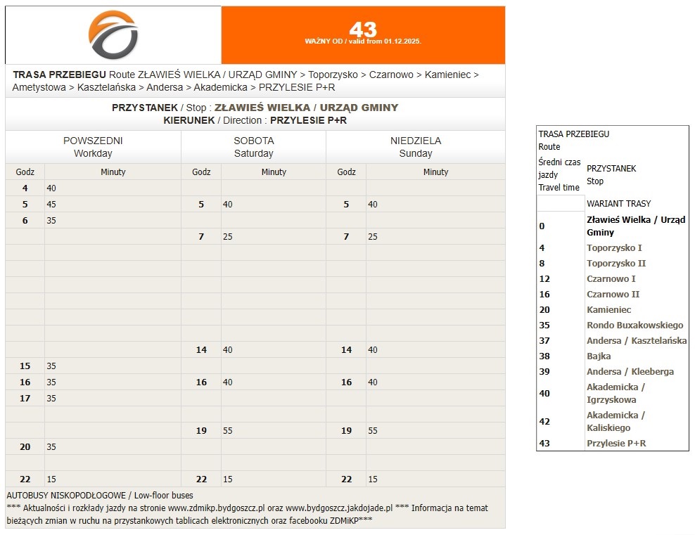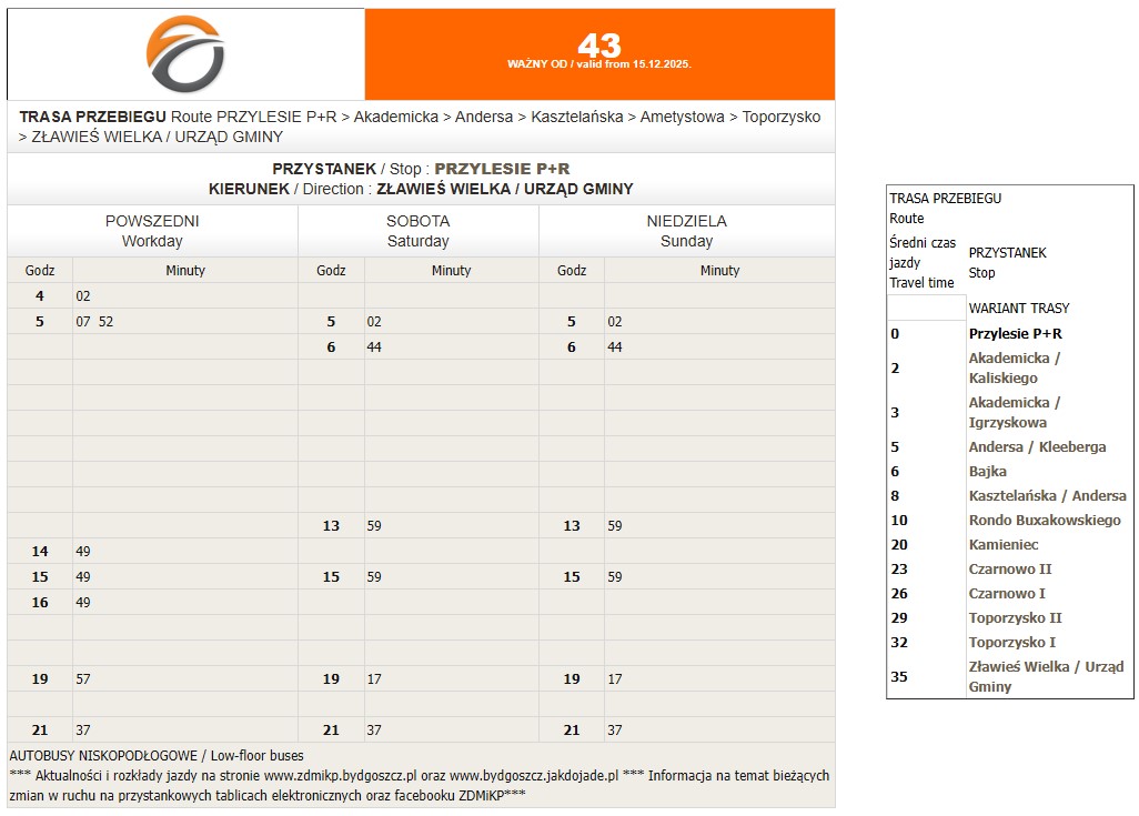 - Skłudzewo, pętla: 04:45, 06:31, 08:25, 10:30, 15:53