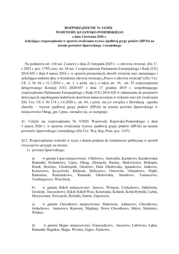 uchylające rozporządzenie w sprawie zwalczania wysoce zjadliwej grypy ptaków (HPAI) na terenie powiatów lipnowskiego i toruńskiego