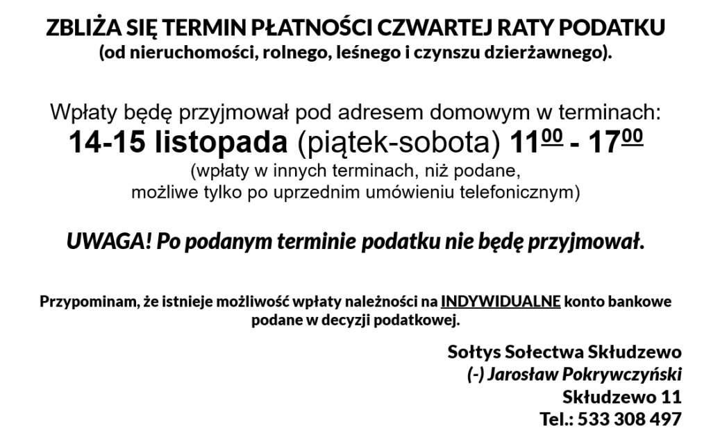 UWAGA! Po podanym terminie podatku nie będę przyjmował.